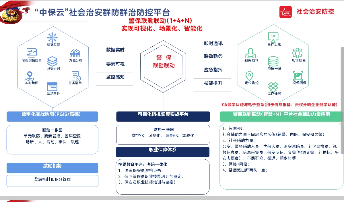 将分散的社会辅助力量(物业公司、保安公司、内保单位、义警等)通过《智慧群防》1+4+N 模式,将公安网、互联网、政务网和物联网四网融合,通过防控一张网、联动一张图和执法记录仪的物联网即时通讯功能,将社会辅助力量串连成专业化的基层自治组织, 大大夯实群防群治力量,从而推动形成共建共治共享的社会综合治理的新局面。